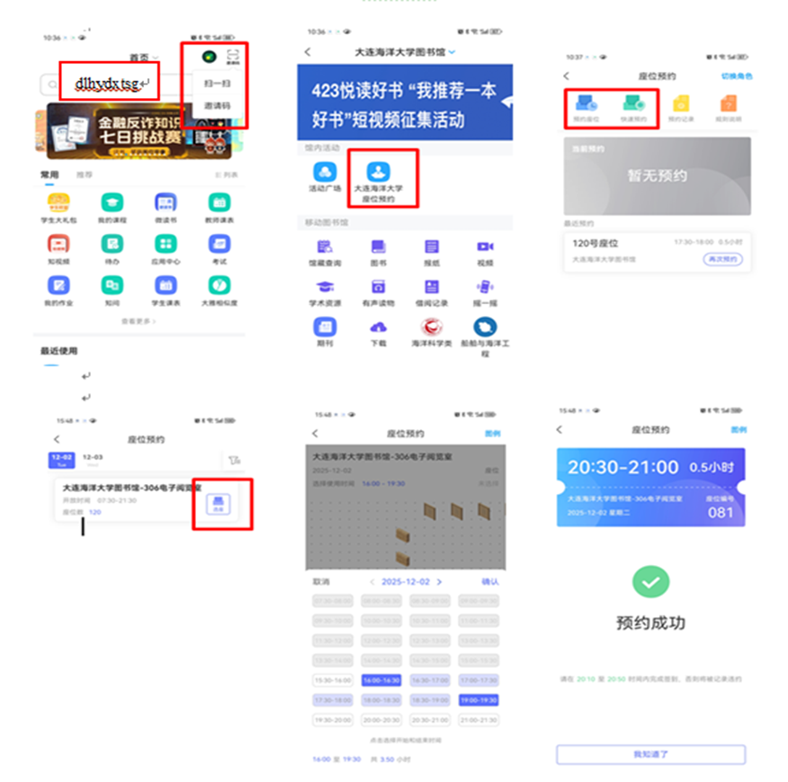 图 1 新注册用户示意图 B.选座: 第一,现场选座。没有提前预约座位的读者到馆后可以现场选择座位进行扫码,预约使用时间,“落座”。(图2) 第二,在线选座。输入邀请码dlhydxtsg(“大连海洋大学图书馆”首字母),选择“大连海洋大学座位预约”。(“预约选座”为自主选择座位,“快速预约”为系统随机分配座位.)(图3)