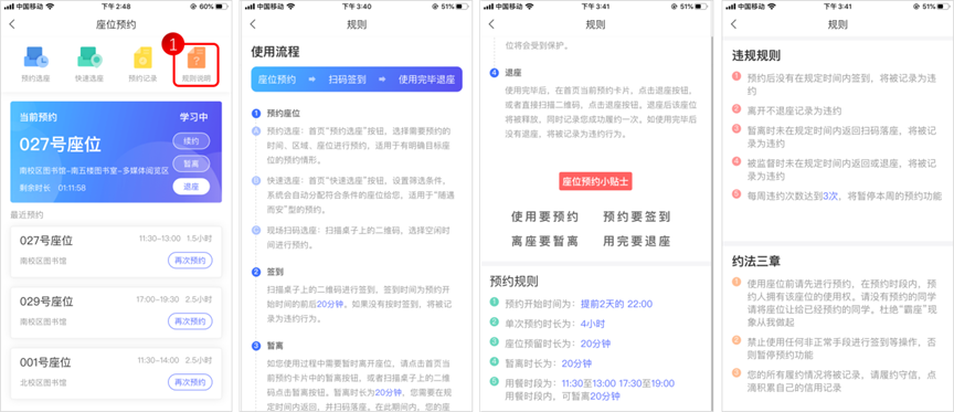 图 6 读者预约规则说明界面图 二、使用规则说明 1. 预约座位:读者单次最多预约时长为4小时,预约座位保留时长为20分钟,预约次数不限。成功预约座位的读者应在规定时间内到所预约座位上扫码“签到”。 预约座位:首页“预约座位”按钮,选择需要预约的时间、区域、座位进行预约,适用于有明确目标座位的预约情形。 快速选座:首页“快速选座”按钮,设置筛选条件,系统会自动分配符合条件的座位,适用于“随遇而安”型的预约。 2.签到:学习通扫描桌子上的二维码进行签到,签到时间为预约时间开始前和后20分钟。签到完成后,系统自动将座位状态从“待履约”改为“学习中”。如果没有按时签到,将被记违约1次。 3.续约:读者选取座位,落座学习后可续约,若该座位后续时段已被他人预约,可新预约其他座位。 4. 暂离:暂离座位需扫码或进入应用首页选择“暂离”座位,暂离后系统自动将座位状态从“学习中”改为“暂离中”,开始20分钟倒计时。读者需在20分钟内回到座位,并扫码签到落座。(用餐时段11:30-13:00和17:30-19:00,读者可暂离时长为90分钟。)暂离期间座位保留,其他读者不可预约,也不可进行监督。 5. 监督:若现场座位无人使用,系统显示“座位正在使用中”,读者可进行“监督”,被监督人需在20分钟内返回座位扫码签到落座。被监督人超过规定时间未落座记违约1次。 6. 退座:当前预约卡片点击“退座”或扫描座位上的二维码,点击“退座”释放座位,逾期未退座的,将被记违约1次。 7. 违规规则: 1) 预约后没有在规定时间内签到,将被记录为违约。 2) 离开不退座,将被记录为违约(每日结束时间22:00自动签退,此时间不记录违约)。 3) 暂离时未在20分钟内返回扫码落座,将被记录为违约。 4) 被监督后未在20分钟内返回或退座,将被记录为违约。 5) 若“违约”满3次后,将暂停本周的预约功能;同时“违约”计次归零。 三、温馨提示: 1.读者如遇紧急事务无法正常履约,可在预约座位预约开始时间之前登陆预约系统取消预约。 2.使用座位前请先进行预约,在预约时间段内,预约人拥有该座位的使用权。请没有预约的同学将座位让给已经预约的同学。杜绝“霸座”现象从我做起。 3.禁止使用任何非正常手段进行签到等操作,否则暂停预约功能。 4.所有履约情况都将被记录,请履约守信,点滴积累自己的信用记录。 四、读者预约流程图: