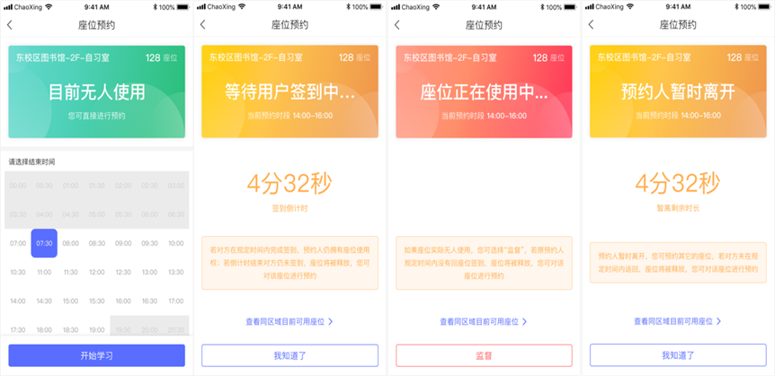 D.暂离:读者使用座位预约系统选座并签到落座后,暂时离开座位需要选择 “暂离”。系统预设临时离开时间为20分钟,在两个用餐时段(11:30-13:00、17:30-19:00)临时离开时间设定为90分钟。(图5)