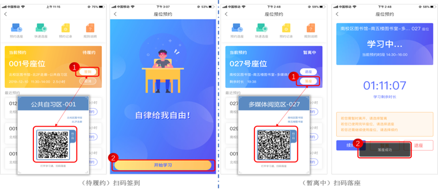 (例如:读者成功预约2025年12月31日8:00-9:00座位001,可在2025年12月31日7:40-8:20扫描桌面上001号二维码进行“签到”。) 图 4 读者扫码签到(暂离落座)界面图